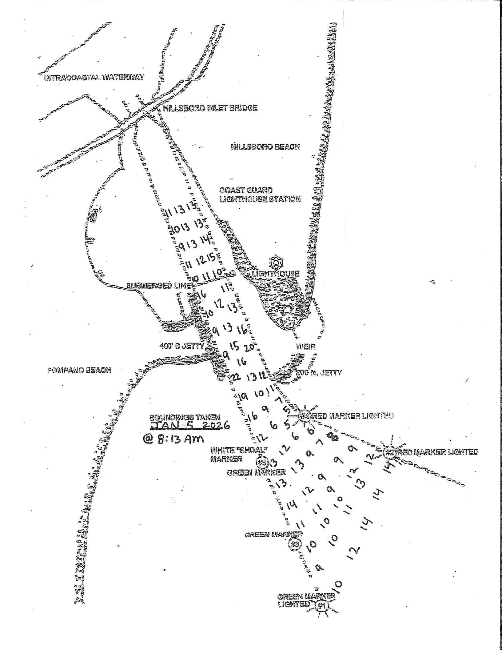 Depth soundings taken from Hillsboro Inlet on January 5, 2026. Please note the following cautions when reading this information: